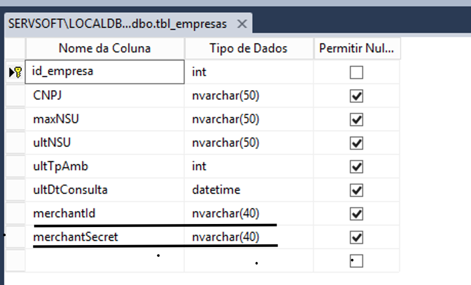 **Passo 4 : **Abra as tabelas do banco NuvemFiscalDB e localize a tabela tbl_empresas, clique com o botão direito e selecione a opção 'Design' e crie os campos: merchantId e merchantSecret com a coluna 'Tipo de dados' como nvarchar(40) para ambos.