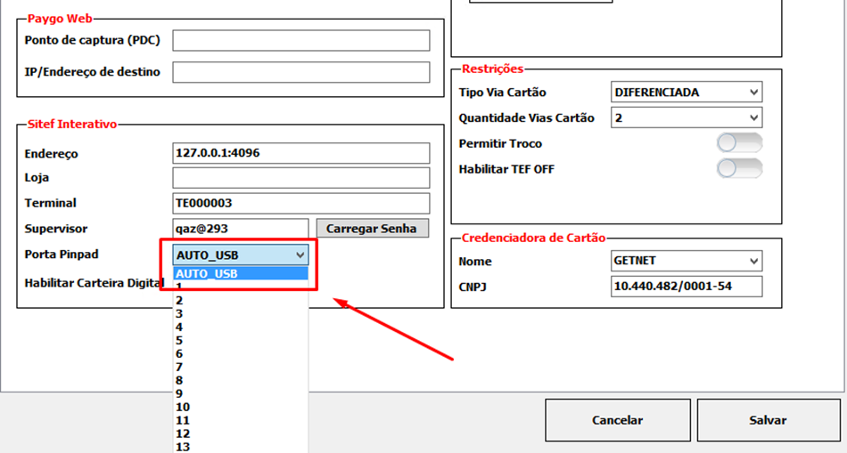 2. Verifique se na Configuração do PDV, na aba TEF, se a Porta Pinpad estácomo AUTO_USB