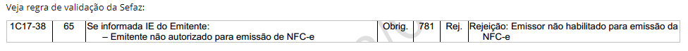 Quando for emitida uma NFC-e e o emitente não estiver devidamente credenciado na Sefaz, será retornado a rejeição "781 - Emissor não habilitado para emissão da NFC-e".