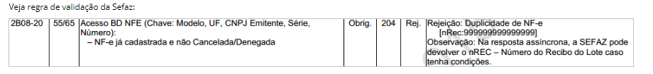 Quando for emitida um NFC-e, com a mesma Chave de Acesso de uma NFC-e já autorizada pela Sefaz, será retornado a rejeição "204 - Duplicidade de NF-e".