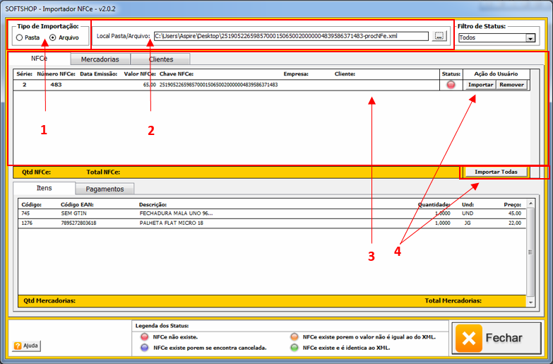 Importar o XML que você baixou pelo Importador de NFCe que fica em Utilitários no Softshop. Selecionar o tipo de importação, se vai uma pasta completa ou apenas um arquivo (1), Localizar a pasta ou o arquivo desejado (2), No ponto 3 podemos ver o cabeçalho dos XMLs importados (3) e Realizar importação de Todas as Vendas ou uma de cada vez (4). OBS: Se a venda já existir não irá importar novamente.