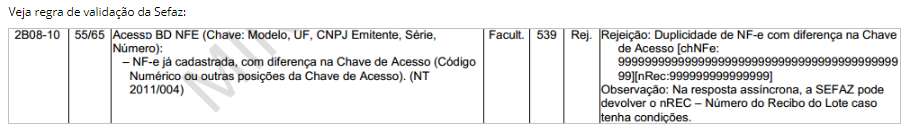 Quando for emitida uma NFC-e e na Sefaz já existir outra NFC-e, já autorizada, com o mesmo CNPJ Emitente, Modelo, Série e Número, mas com, Data de Emissão, Tipo de Emissão ou Código Numérico ou outras posições da Chave de Acesso diferentes, será retornado a rejeição "Duplicidade de NFC-e, com diferença na Chave de Acesso".
