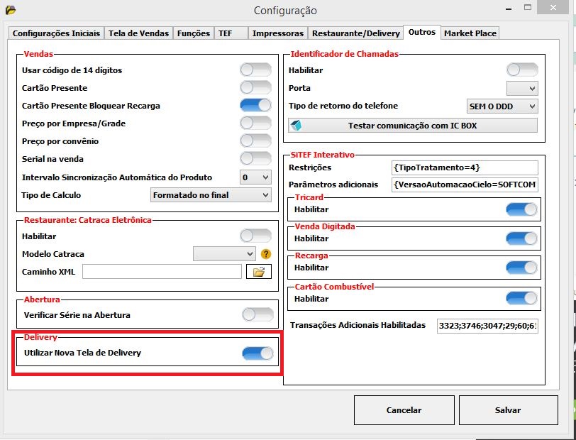 5- Nas configurações do PDV, ativar a configuração "Utilizar Nova Tela de Delivery", na aba "Outros", bloco "Delivery", conforme imagem abaixo: