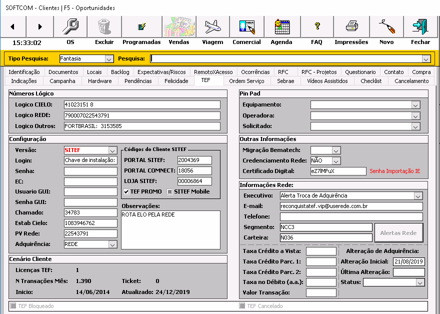 1 - Necessário que o cliente já possua o TEF contratado com a Softcom ou com outra empresa que comercialize TEF. - Como saber se o cliente possui TEF com a Softcom?