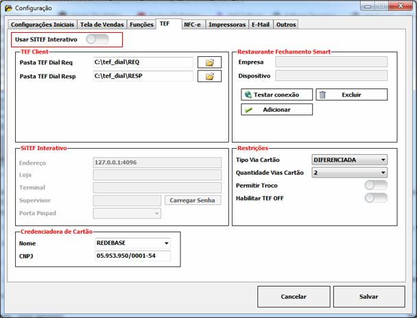 2.4 - Cliente com TEF de terceiros - Desabilitar a opção "Usar SITEF Interativo" e informar o caminho das pastas Req/Resp (Geralmente c:\tef_dial\REQ , c:\tef_dial\RESP).
