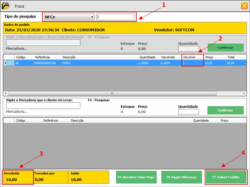 3- Em "Tipo de Pesquisa" (1) selecione "NFCe" se estiver com o cupom eletrônico em mãos ou "Pedido" se estiver com o número do pedido no sistema, como exemplo vamos buscar pela NFCe nº 1. Serão exibidas as mercadorias dessa venda, dê um clique duplo na coluna "Devolver" (2) e informe a quantidade que será devolvida. Após isso você pode ver o Saldo Devolvido (3) e clicar na opção "F7 - Salvar Crédito" (4).