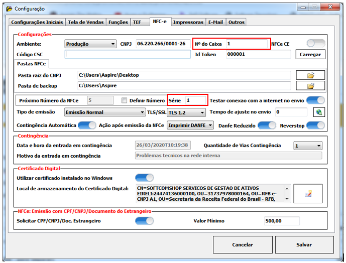 Quando tento salvar as configurações do Softshop Caixa apresenta mensagem "Série - Informe a Série".