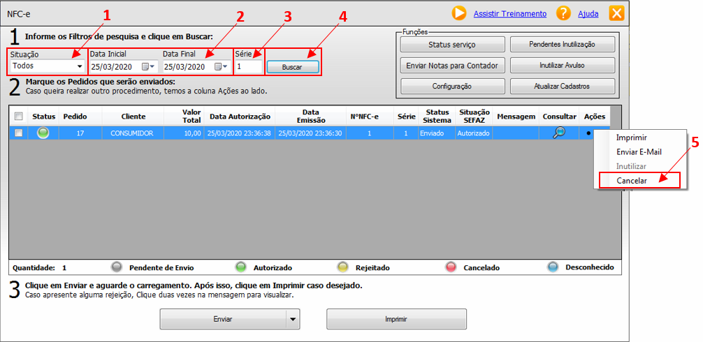 2. Selecione a situação desejada ** 1 **, selecione o período 2 , selecione a série 3 e clique em Buscar 4. Com os cupons filtrados clique nos 3 pontinhos da coluna "Ações " na linha do cupom que deseja cancelar e clique na opção Cancelar 5.