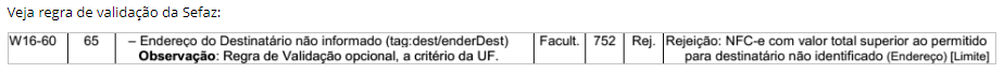 Ao emitir uma NFC-e aparece a mensagem "Rejeição: NFC-e com valor total superior ao permitido para destinatário não identificado o endereço". (Rejeição 752)