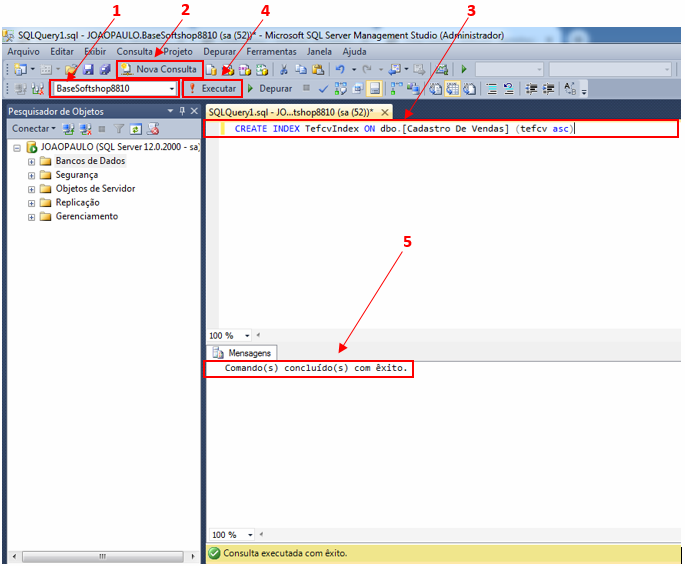 Caso o sistema seja em SQL, ir no SQL Server Management Studio, Selecionar o banco de dados (1), Clicar em Nova Consulta (2), Colar a instrução que deseja executar uma de cada vez (3), Clicando em Executar a instrução será executada (4) e a Mensagem de êxito informada no ponto (5). Segue abaixo da imagem as consultas para execução.
