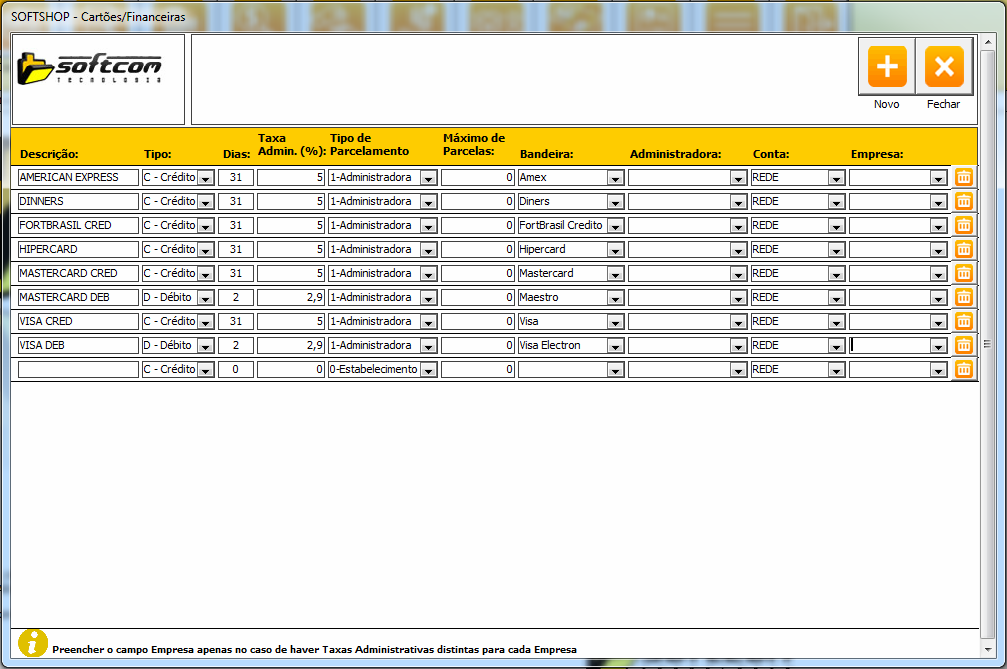 Cadastro -> Cartões/Financeiras (deve estar preenchida).