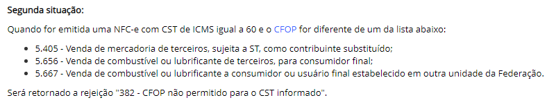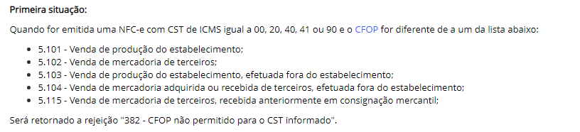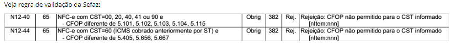 Ao emitir uma NFC-e aparece a mensagem "Rejeição: CFOP não permitido para o CST informado". (Rejeição 382)