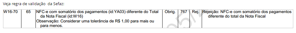 Ao emitir uma NFC-e aparece a mensagem "Rejeição: Total do Produto/Serviço difere do somatório total de pagamentos para NFC-e". (Rejeição 767)
