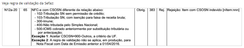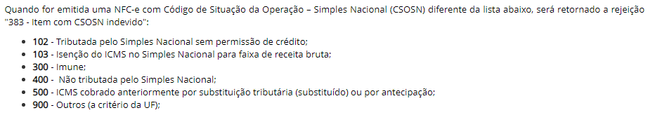 Quando for emitida uma NFC-e com Código de Situação da Operação – Simples Nacional (CSOSN) diferente da lista abaixo, será retornado a rejeição "383 - Item com CSOSN indevido"**
