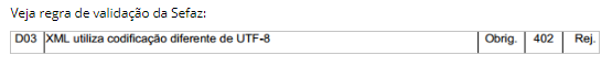 Quando for emitida um NFC-e e a codificação de dados do(s) campo(s) for diferente de UTF-8, será retornado a rejeição "402 - XML da área de dados com codificação diferente de UTF-8". Em outras palavras, quando no XML, houver caracteres que não estão inclusos no conjunto de caracteres da codificação UTF-8, será retornado rejeição. Esses casos normalmente estão associados a letras acentuadas.