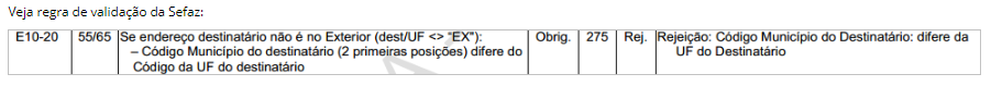 Quando for emitida uma NFC-e para destinatário localizado no Brasil (com UF diferente de EX - Exterior) e os dois primeiros dígitos do código do município for diferente do Código da UF correspondente a Sigla da UF informada nos dados do endereço do destinatário, será retornado a rejeição "275 - Código Município do Destinatário: difere da UF do Destinatário".