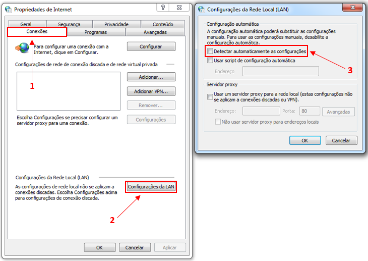 1- Em Painel de Controle > Opções da Internet > Aba Conexões > Configurações da LAN > Desmarcar a opção "Detectar automaticamente as configurações".