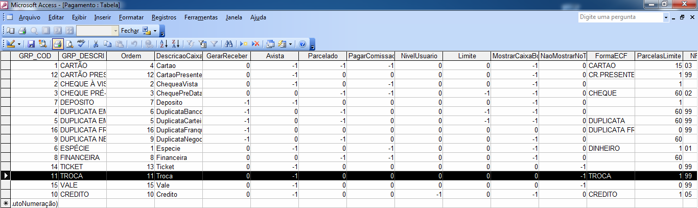 2 - Inserir a forma de pagamento "TROCA" na tabela pagamentos do sistema do cliente copiando o registro do SOFTSHOP_ORIGEM.