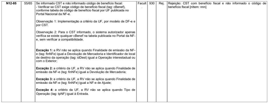 Quando for emitida NFC-e e não informado o código de benefício fiscal para CST - Código da Situação Tributária que exige o código de benefício fiscal, haverá a rejeição pelo motivo "930 - CST com benefício fiscal e não informado o código de benefício fiscal".