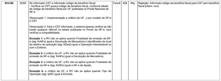 Quando for emitido um NFC-e e informado o código de benefício fiscal para CST - Código da Situação Tributária sem benefício fiscal, haverá a rejeição pelo motivo 928 - Informado código de benefício fiscal para CST sem benefício fiscal.
