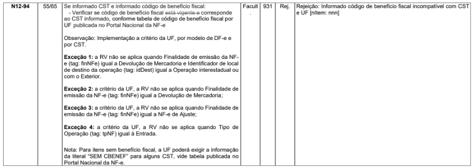 Quando for emitida uma NFC-e e informado o código de benefício fiscal incompatível com o CST - Código da Situação Tributária de acordo com a Tabela de Código de Benefício Fiscal por UF, haverá a rejeição pelo motivo "931 - Informado código de benefício fiscal incompatível com CST e UF".