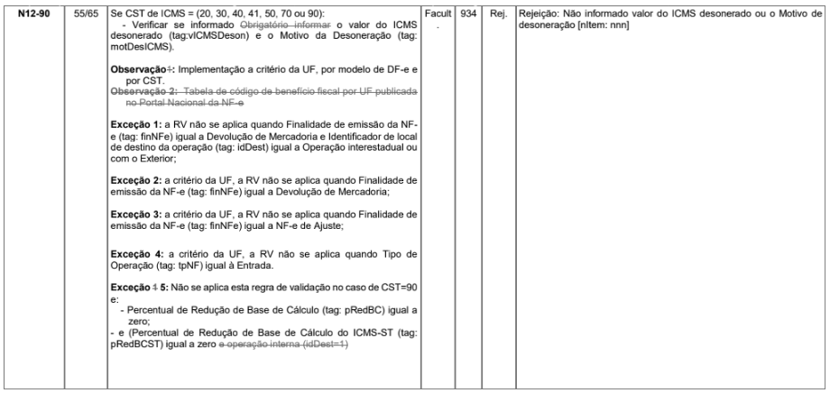 Quando for emitida uma NFC-e e o CST - Código da Situação Tributária de ICMS for igual a '20', '30', '40', '41', '50', '70' ou '90' e não for informado o Valor do ICMS Desonerado e o Motivo da Desoneração, haverá a "rejeição 934 - Não informado valor do ICMS desonerado ou o Motivo de desoneração".