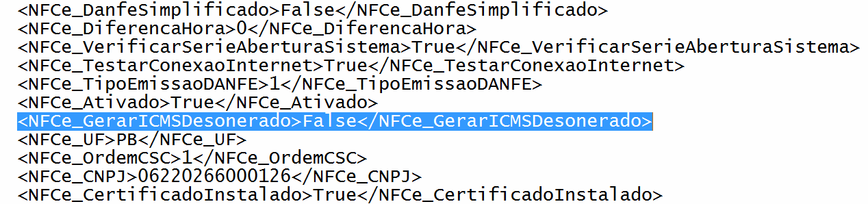 4- Abrir o arquivo "softshop.xml", localizado em Appdata (C:\Users[nome do usuário]\AppData\Local\Softcom Tecnologia\softshop.xml), encontrar a configuração "NFCe_GerarICMSDesonerado" e alterar para "True".