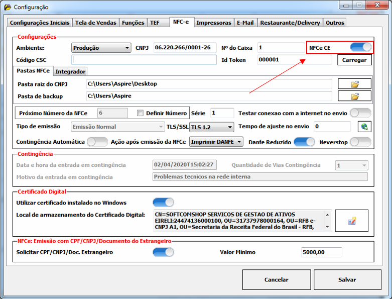 Na configuração do Softshop Caixa, na aba NFC-e, a opção "NFC-e CE" está marcada.