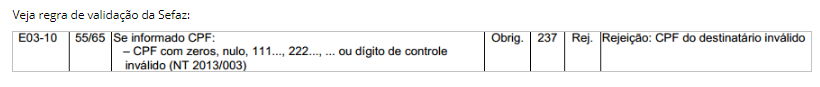 Quando for emitida uma NF-e e o CPF do Destinatário for informado com apenas zeros, com sequência numérica incorreta ou dígito de controle (último número do CPF) inválido, será retornado a "rejeição 237 - CPF do destinatário inválido".