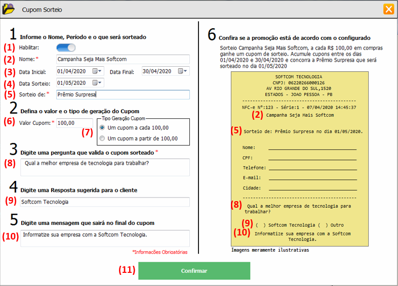Bloco 6 da tela: Nesse ponto podemos visualizar como a impressão do cupom sorteio vai ficar, por fim clicar no botão Confirmar (11) e realizar uma venda de teste para visualizar as impressões.