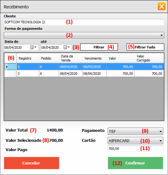 4 - Nessa tela vamos selecionar e receber as parcelas desejadas. Devemos selecionar o cliente (1), escolher a forma de pagamento que será filtrada (2) se deixarmos em branco vai trazer todos os débitos que esse cliente tem em aberto, após isso podemos informar um período específico (3) e depois clicar "Filtrar" (4) ou podemos clicar direto no botão "Filtrar Tudo" (5) para filtrar todos os débitos independente de data. No sub irá mostrar os débitos filtrados (6) onde posso selecionar um registro ou quantos quiser. No rodapé da tela temos a contabilização mostrando o "Valor Total" (7) dos débitos filtrados desse clientes, o "Valor Selecionado" (8), a "Forma de Pagamento" que será realizada (9) podendo ser Espécie, POS e TEF, se a forma de pagamento for com cartão informamos no campo "Cartão" (10), "Valor Pago" (11) e "Confirmamos" (12) o recebimento.