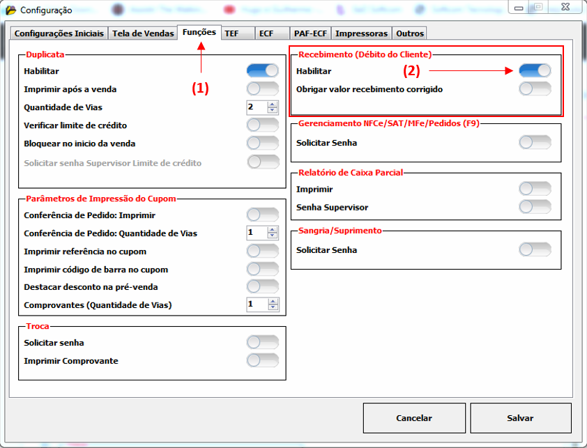 1 - Habilitar a opção "Recebimento" acessando as configurações do Softshop Caixa > Aba Funções (1) > Recebimento (Débito do Cliente) (2).