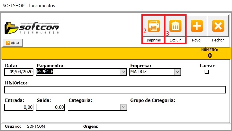 4 - Você também tem a opção de imprimir (2) ou excluir (3) o laçamento.