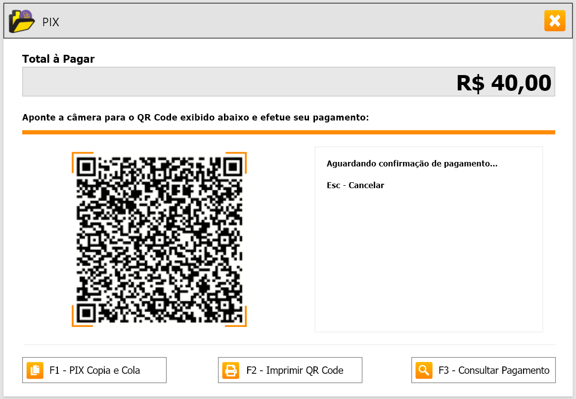 Passo 3: Ao realizar uma venda, na tela de pagamentos, terá a opção PIX. Ao inserir o valor pago e tentar finalizar a venda, será exibida uma janela com o QR Code para que o cliente realize o pagamento;