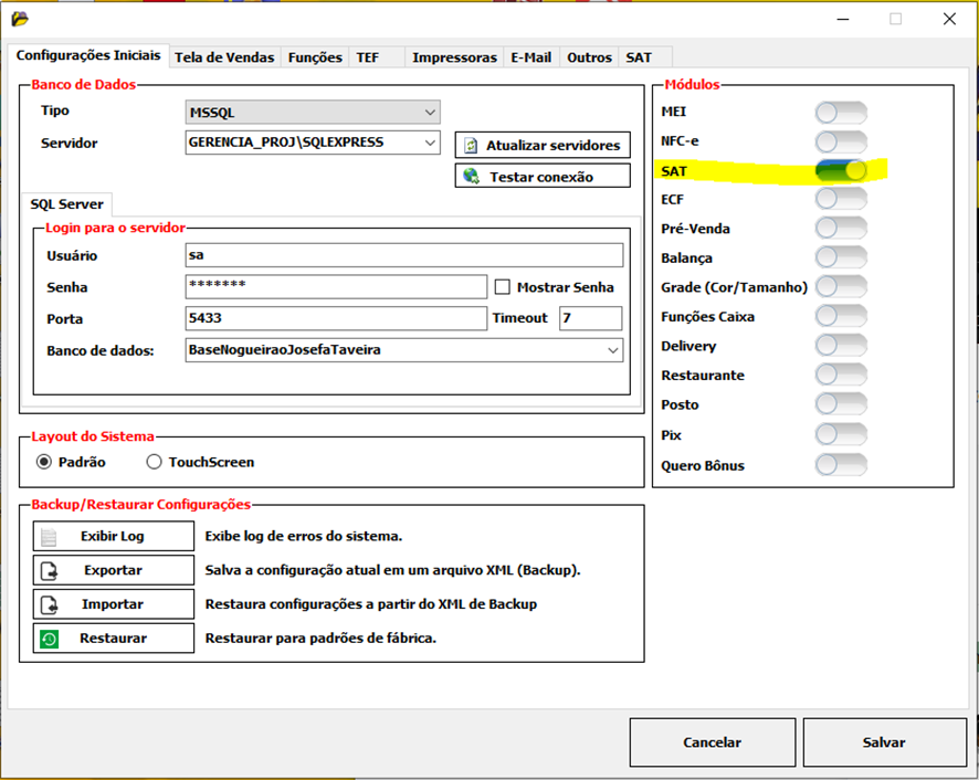 3 - Nas configurações do caixa deve-se marcar o módulo SAT.