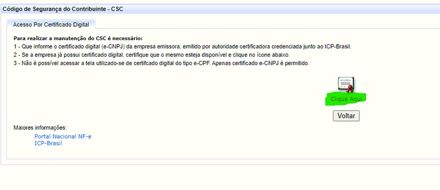 OBS: O certificado devera estar instalado no computador que ira gerar o CSC.