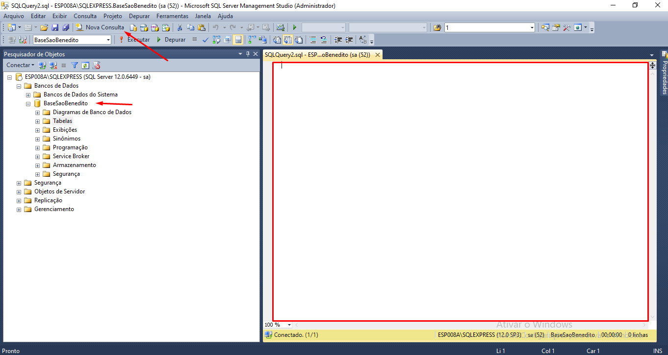 Abrir o SQL Server e abrir a tela de "Nova Consulta" no banco de dados que deseja fazer a correção;
