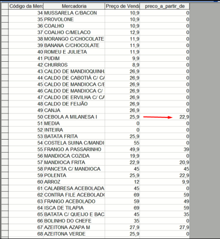 Causa: Ocorre quando o combo da mercadoria é removido de forma incorreta ou seja, caso o combo seja desativado e em seguida excluído as informações que compõem o combo, o valor que é inserido na coluna preco_a_partir_de na tabela cadastro de mercadorias é mantido, fazendo com que o PDV ao puxar as mercadorias some o valor do preço de venda com o valor do preco_a_partir_de, exibindo o valor incorreto de venda no PDV. Como pode observar no exemplo abaixo:
