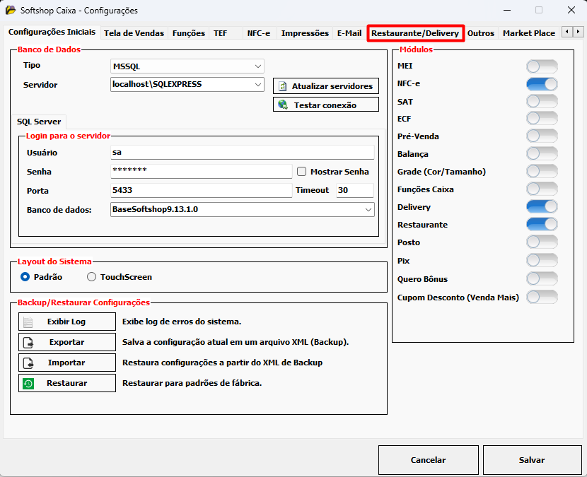 2 - Acessar as configurações do PDV e clicar na aba "Restaurante/Delivery":