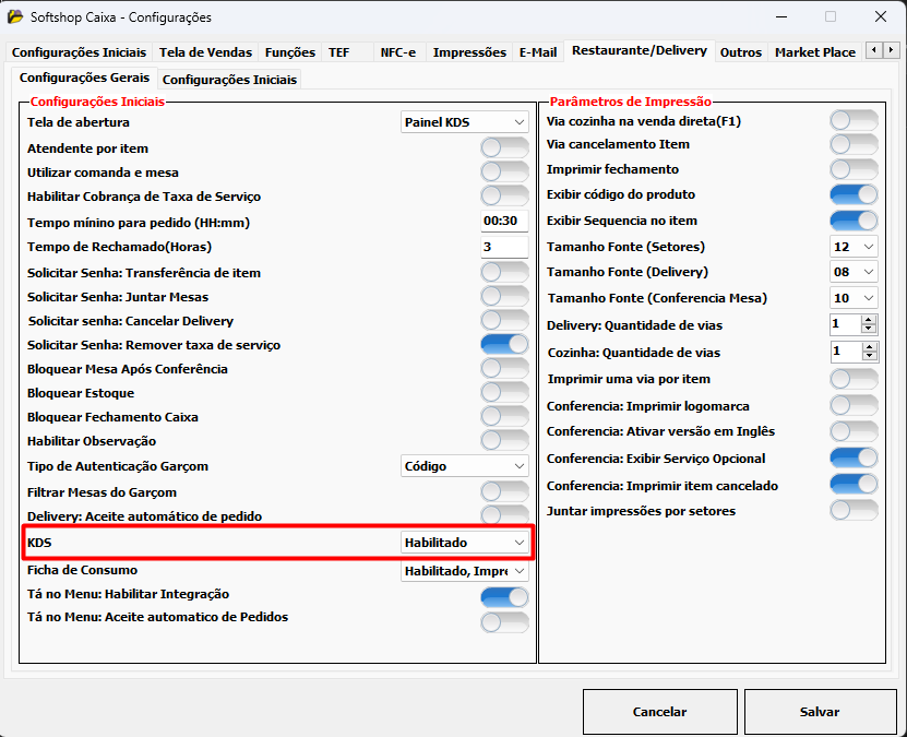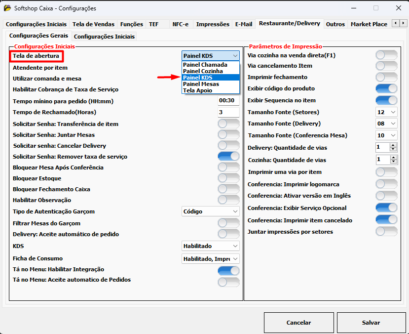 Como habilitar o KDS no Softshop Caixa (PDV) e defini-lo como tela de abertura