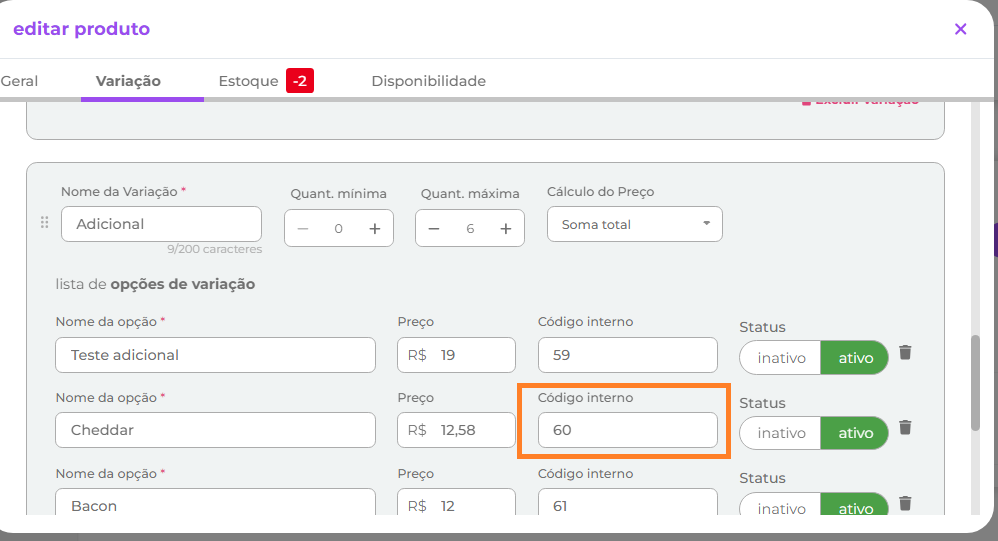 1.2.2.3- Para os adicionais, o código interno da aba variações do portal do Quero Delivery com o código da mercadoria definido no retaguarda conforme imagens: