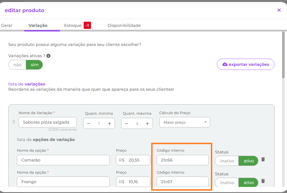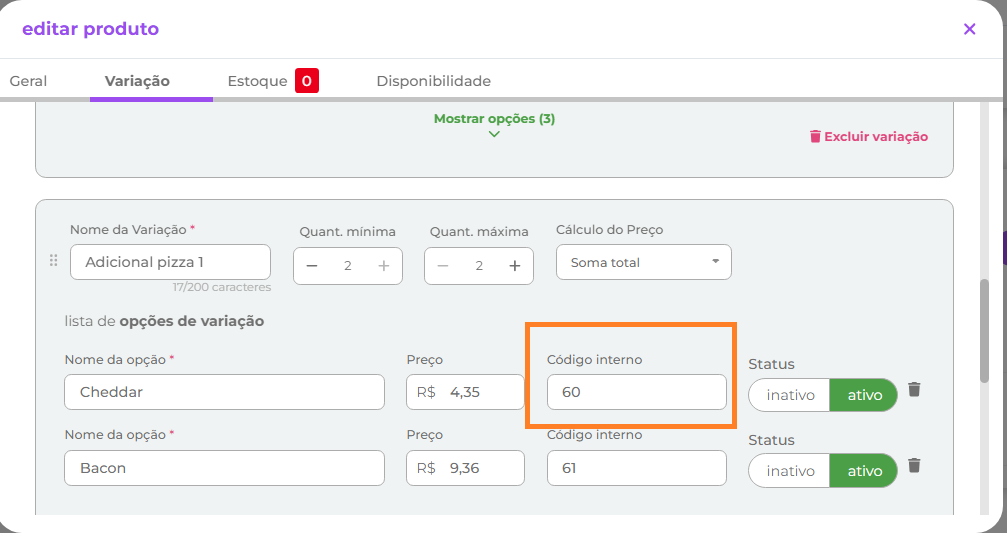 1.2.1.3- Para os adicionais, o código interno da aba variações do portal do Quero Delivery com o código da mercadoria definido no retaguarda conforme imagens: