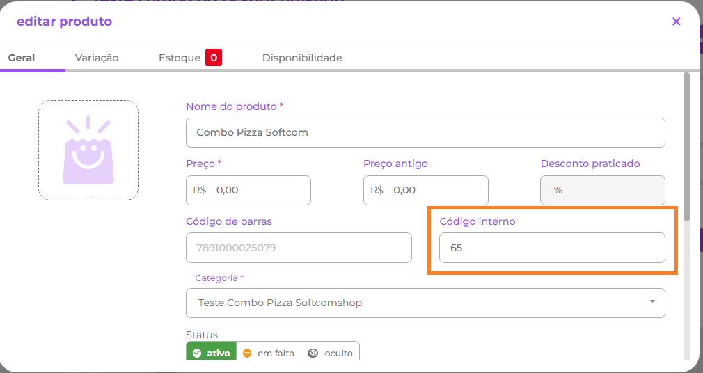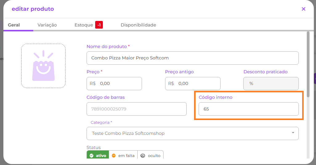 1.2.1.2- Para os itens do combo, o código interno da aba variações do portal do Quero Delivery deve ser preenchido com o código PDV exibido no retaguarda, conforme imagens: