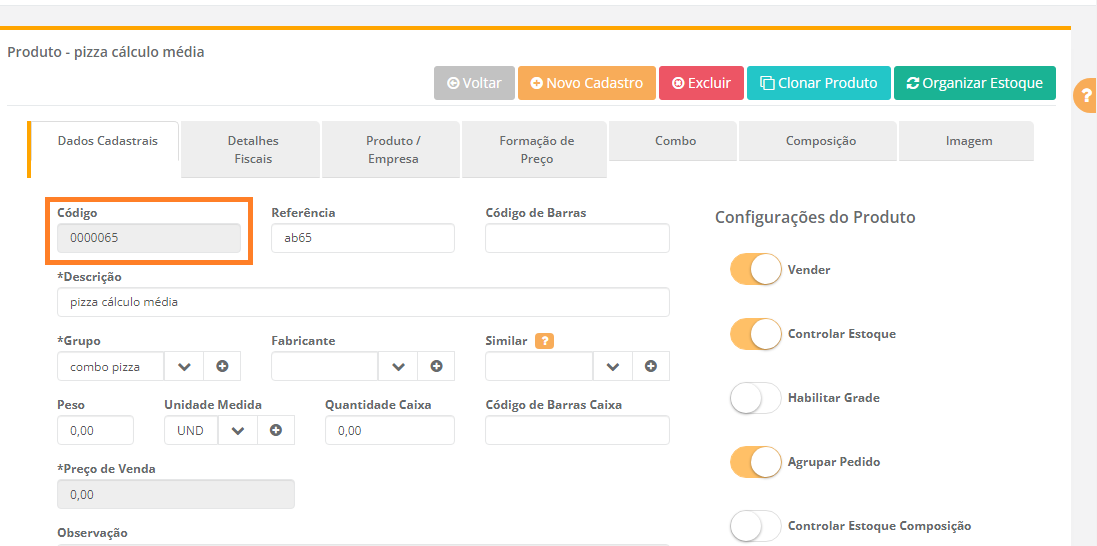 1.2.3- Cadastrar um produto que é pizza e o cálculo será maior preço: