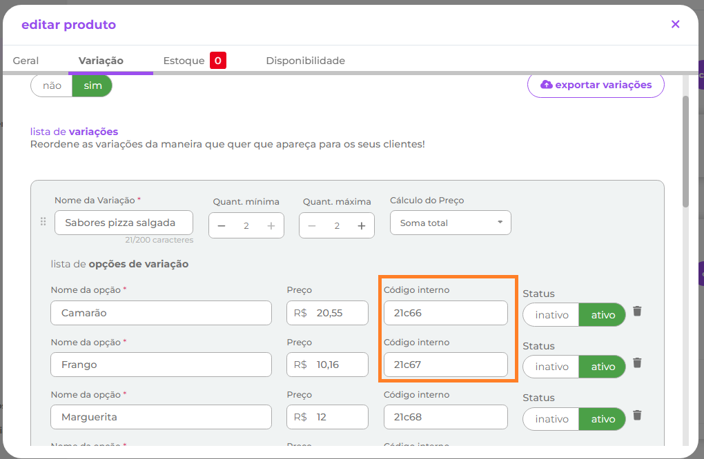 1.2.2.2- Para os sabores da pizza, o código interno da aba variações do portal do Quero Delivery deve ser preenchido com o código PDV exibido no retaguarda, conforme imagens:
