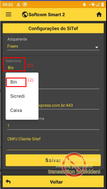 - 6.1. Selecione: Ao abrir serao listadas as adquirentes que a Fiserv comtempla, Bin, Caixa ou Sicredi. Selecione a que o cliente irá utilizar. No exemplo estaremos configurando a Bin.