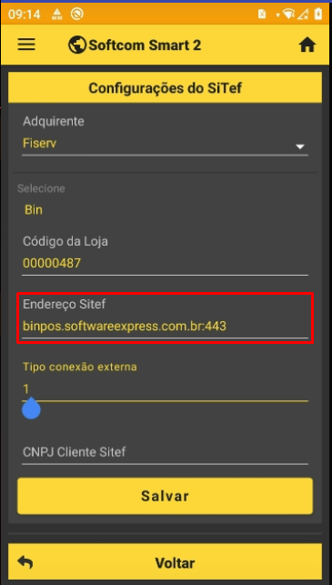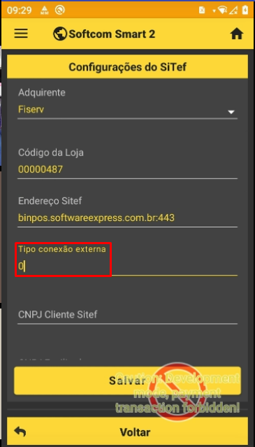 Obs: Caso seja optado por usar a conexao por chip, será necessario solicitar a liberacao do dominio na empresa responsavel e preencher o tipo de conexao com o valor "0". É necessario também alterar o endereco sitef para os enderecos de producao para comunicao. Sendo eles: