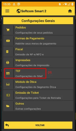 - Apos isso vincular o dispositivo ao ERP seja ele Softcomshop ou Softshop logar com o usuario desejado no smart e acessar as Configuracoes > TEF.