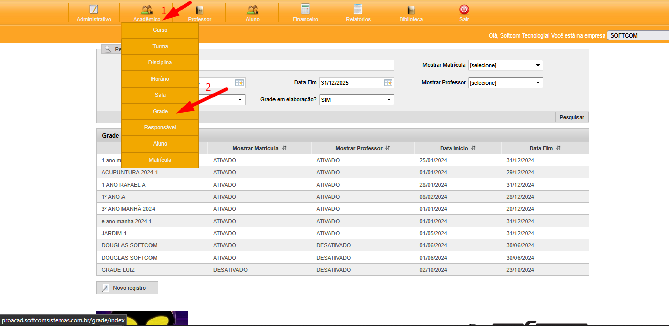 Solução** : 1 Acadêmico > 2 Grade > Ao selecionar a grade correspondente