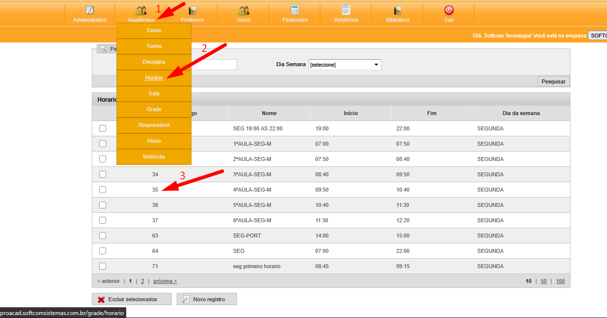 2 Filtrar o grade_horario_id no dia criado em Acadêmico > Horário > no campo Código, no exemplo será o 35